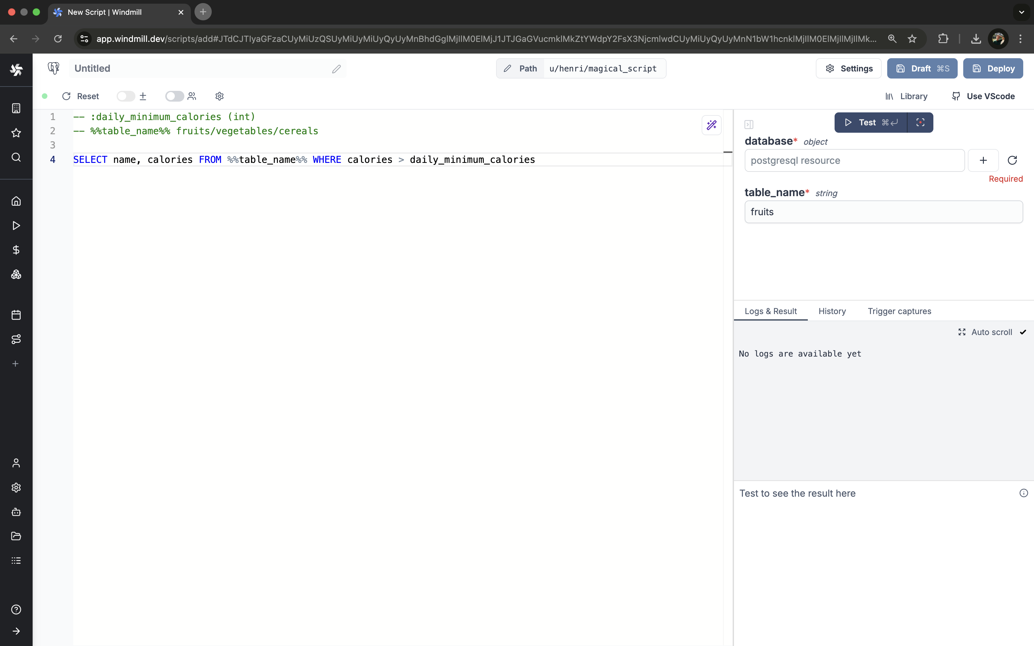 Pin database resource path directly within a SQL script instead of filling it through the UI.